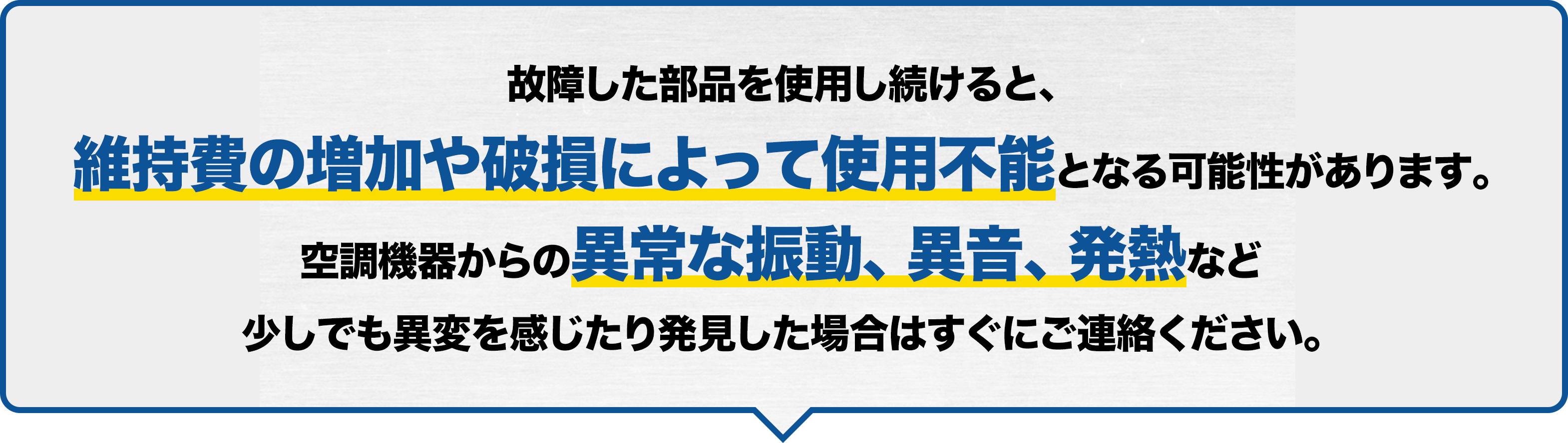 ファン、モーターに異常が生じると、ほとんどの場合、異音・振動・温度上昇などの症状が現れます。日常点検は、この点を重視して行ってください。モーターベアリングの交換目安時期は導入後20,000~30,000時間と言われています。